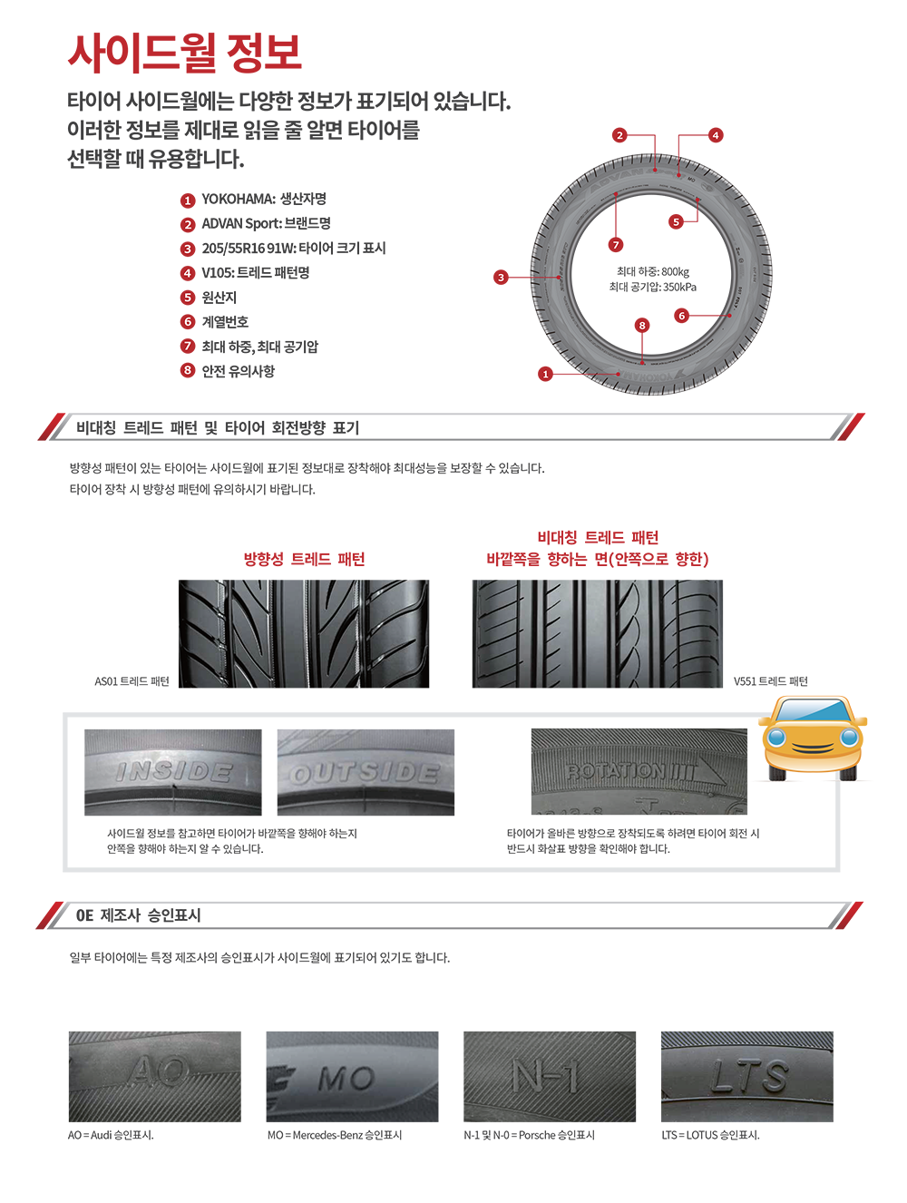 타이어 상식 기본 타이어 상식 사이드월 정보 사이드월 정보 런플렛 타이어 런플렛 타이어 공기압과 하중지수 공기압과 하중지수 타이어 점검 활동은 고객의 안전 운전을 위해서 빼놓을 수없는 노력이며 동시에 타이어를 판매할 수 있는 계기가 되는 중요한 활동입니다. 고객의 안전 운전을 위해서 빼놓을 수 없는 타이어 안전 점검은 안전이라는 관점에서 고객과 신뢰관계를 구축할 수 있으며 타이어 상태에 따라서는 판매로도 이어질 수 있는 중요한 활동입니다. 부디 많은 고객에게 점검 요청을 하여 한 대라도 더 많이 타이어 안전 점검을 할 수 있도록 신경써 주십시오. 곧바로 실시할 수 있는 타이어 안전 점검의 기본은 크게 4가지로 공기압 점검, 홈 잔량 점검, 편마모 점검, 외상 정검입니다. 여러분이 실시해야 할 타이어 안전 점검 활동은 공기압, 홈 잔량, 편마모, 외상의 4가지 점검 활동입니다. 어떠한 경우이든 우선은 눈으로 보고 이상을 발견하는 육안 점검부터 시작하며 그 후에 게이지나 직접 손으로 만져보며 점검합니다. 육안 점검은 누구라도 간단히 할 수 있으며 대부분의 타이어 불량은 이 육안 점검을 통해서 발견할 수 있습니다. 타이어 안전 점검 중에서도 가장 기본적인 점검입니다. 타이어 공 기는 타이어에 이상이 없어도 자연스럽게 줄어듭니다. 공기압 부 족은 예상치 못한 사고로 이어지는 경우도 있으므로 정기적인 공 기압 점검은 빼 놓을 수 없습니다. 타이어의 홈의 깊이를 조사하는 점검입니다. 우선은 육안으로 타이어의 홈 깊이가 많이 남아있는지 또 "트레드 마모한계 표시"(타이어의 홈이 1.6mm 이하가 되면 노출) 가 나타나지 않았는지 체크합니다. 공기압 과부족이나 얼라인먼트의 불량 등으로 인하여 발생하는 타이어의 편마모. 우선은 눈으로 보고 체크하는 육안 점검을 하고 편마모가 발생한 경우에는 직접 손으로 만져보며 점검을 실시. 상 태에 따라 타이어의 위치교환, 휠 얼라인먼트 테스트를 권장하거나 타이어를 교체해야 하는 필요성을 설명합니다. 타이어의 상처나 크랙 등 타이어의 외상을 체크합니다. 특히 타이 어의 상처는 최악의 경우 펑크 등의 직접적인 원인이 될 수도 있 습니다. 상태가 심각한 경우에는 안전 측면에서 교체를 제안하여 주십시오. 공기압 점검은 고객의 안전 운전과 판매점의 타이어 판매로도 이어지는 기본 점검입니다. 스태프 여러분 한사람 한사람이 확고한 의식을 가지고 실시합니다. 공기압점검은 반드시고객에게 양해를 구한 후에 실시합니다. 육안 체크를 신속하게 끝낸 후에 에어 게이지로 정확한 공기압 점검을 한다는 취지를 반드시 설명 하고 고객에게 양해를 구한 다음에 점검 작업을 실시합니다. 정기정인 공기압 점검의 필요성을 강조합시다. 오차가 없는 에어 게이지를 사용해서 정확하게 계측하여 주십 시오. 점검 결과는 "적정 공기압에서 00kPa 부족하므로 충전 해 두겠습니다" 등 구체적인 수치와 함께 보고합니다. 주의 공기압 점검·조정은 타이어가 식은 냉간 시에 하는 것이 원칙입니다. 또 공기압 체크와 동시에 밸브의 공기 누출도 체크합시다. 적정 공기압이더라도 점검 결과는 반드시 고객에게 보고합니다. 공기압 점검 결과가 적정 공기압이더라도 반드시 고객에게 보고합니다. 이러한 확실한 태도가 고객의 신뢰 획득으로 이어집니다. 정기적인 공기압 점검의 필요성을 강조합시다. 공기압이 부족한 고객은 물론 공기압이 적정한 고객에게도 타이어의 공기는 저절로 빠져나간다 는 점을 설명하고 정기적인 공기압 점검의 필요성을 강조하여 주십시오. 타이어의 공기는 저절로 빠져나간다는 점을 성명합니다. 타이어의 공기는 타이어에 상처나 크랙 등이 없어도 저 절로 빠져나갑니다. 1개월에 약 10kPa~20kPa 빠져버 린다는 점을 고객에게 설명하고 정기적 (1달에 1번) 인 공기압 점검을 하도록 거듭해서 설명합시다. 공기압이 과부족하면 편마모로 이어진다는 점을 성명합니다. 타이어의 공기압은 너무 높아도 너무 낮아도 안 됩니다. 공기압이 적정 범위를 벗어나면 숄더 마모나 센터 마 모와 같은 편마모를 유발시키며, 안전성은 물론 타이어 수명을 단축시키는 원인이 된다는 점을 설명합시다. 공기압이 적정하지 않으면 연비가 나빠진다는 점을 설명합니다. 타이어의 공기압이 부족하면 회전 저항 (타이어의 주행 저항) 이 늘어나고 그 만큼 연비도 나빠집니다. 좋은 연비 절약 성능으로 정평이 난 ECO 타이어 DNA 시리즈도 공기압이 적정하지 아니면 그 연비 절약 성능을 충분히 발휘 할 수 없습니다. 연비 절약을 위해서도 타이어의 공기압을 자주 체크하여 언제나 적정 공기압을 유지해야 한다는 점을 강조하여 주십시오. 홈 잔량 점검은 육안으로 할 수있는 간편한 점검입니다. 한 대라도 많은 자동차를 점검할 수있도록 하십시오. 홈의 깊이가 낮아지면 특히 비가 오는 날 등은 매우 위험합니다. 우선은 간단한 육안 점검을 한 후 홈의 깊이 가 낮을 때에는 뎁스 게이지로 점검하여 주십시오. 홈 잔량 점검은 우선 육안으로 체크하여 주십시오. 타이어의 홈의 깊이가 많이 남아 있는지 또 타이어의 사용 한계를 나타내는 "트